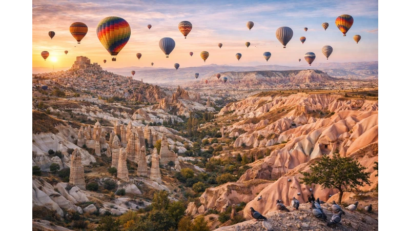 One of the most unforgettable experiences in Cappadocia is taking a hot air balloon ride at sunrise, when hundreds of colorful balloons float above the valleys.
