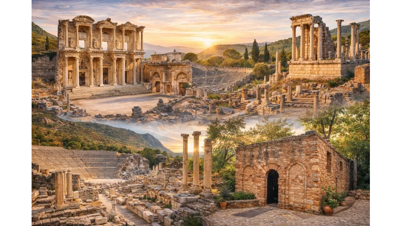 Visitors can walk along the marble streets and see iconic structures like the Library of Celsus, the Great Theatre, and impressive Roman temples.