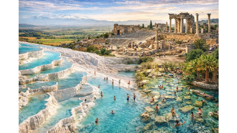 Just above the terraces lies the ancient Roman spa city of Hierapolis, where travelers can explore ancient ruins and even swim in the famous Cleopatra Pool.